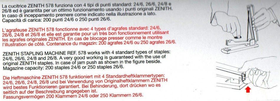 Popis produktu: Profesionálna talianska zošivačka masívnej a patentovanej konštrukcie s predĺženým ramenom do hĺbky 130 mm. Protizasekávací systém. Testované na zošitie 1 000 000 cyklov.Vhodné pre spojovače 24/6, 26/6, 24/8 a 26/8 Kapacita zásobníka pre spojovače 24/6 200 ks, pre spojovače 26/6 250 ks. Zošije 35 listov 80 gsm. Kvalitu ocenia najmä učtovníci, exekútory atď., najmä pri použití spojovačov ZENITH 24/6 so zabrúsenými hrotmi atď.